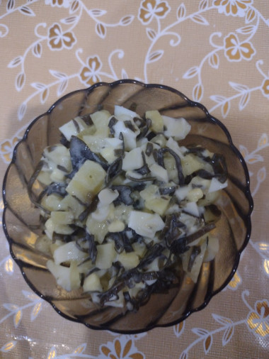 полезный салат! морская капуста - источник йода. а с картошкой - будет сытнее и наверно мягче на вкус.