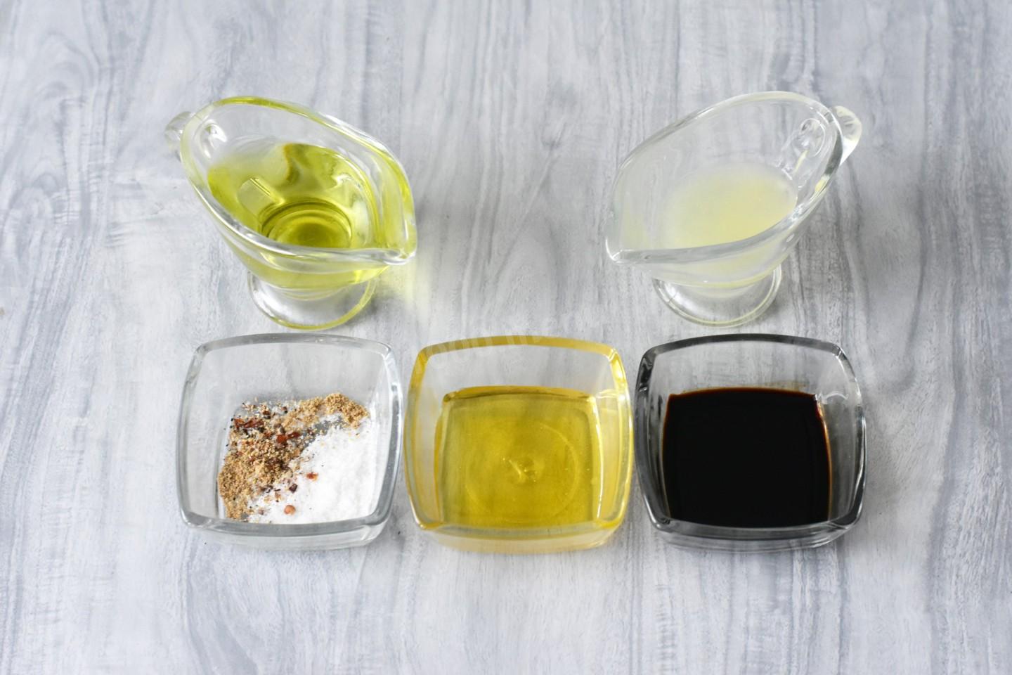 Для начала подготовьте все необходимые ингредиенты для заправки. Масло я брала оливковое прямого отжима (extra virgin), но можете взять любое растительное по вкусу.