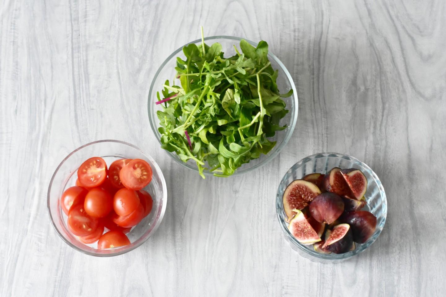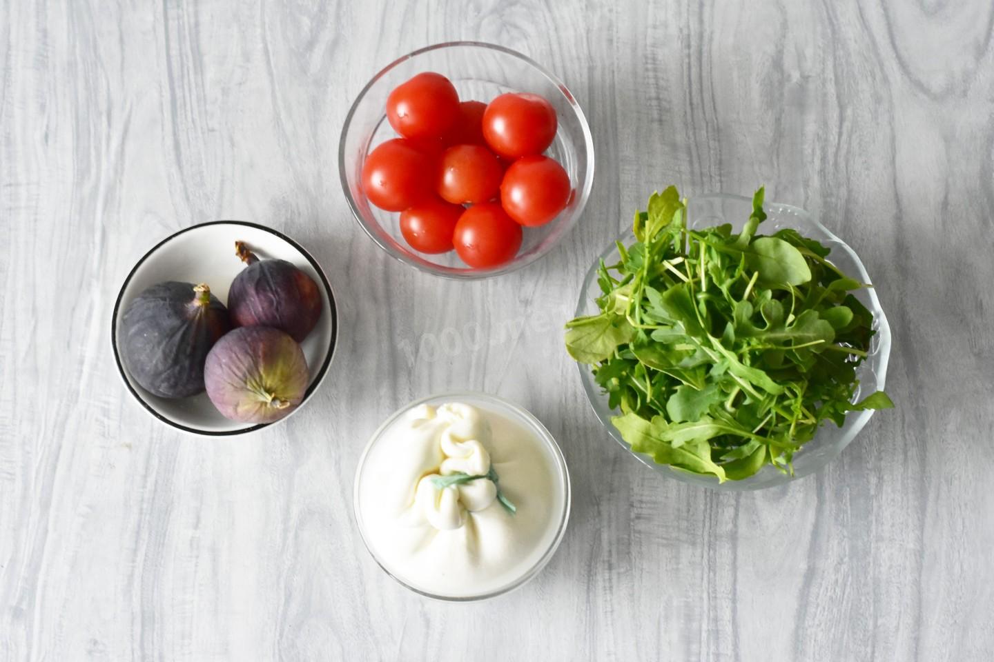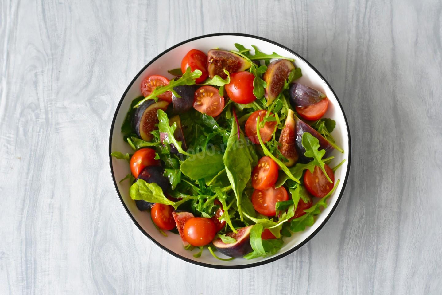 Помидоры черри вымойте, обсушите и разрежьте пополам. Если у вас обычный помидор, то нарежьте его дольками. Помидоры нужны спелые, но плотные. Инжир вымойте, обсушите и нарежьте дольками. Салатные листья промойте и обсушите.