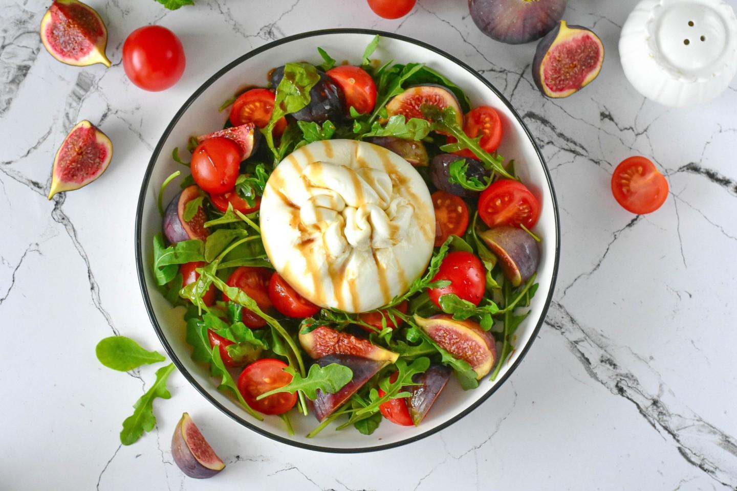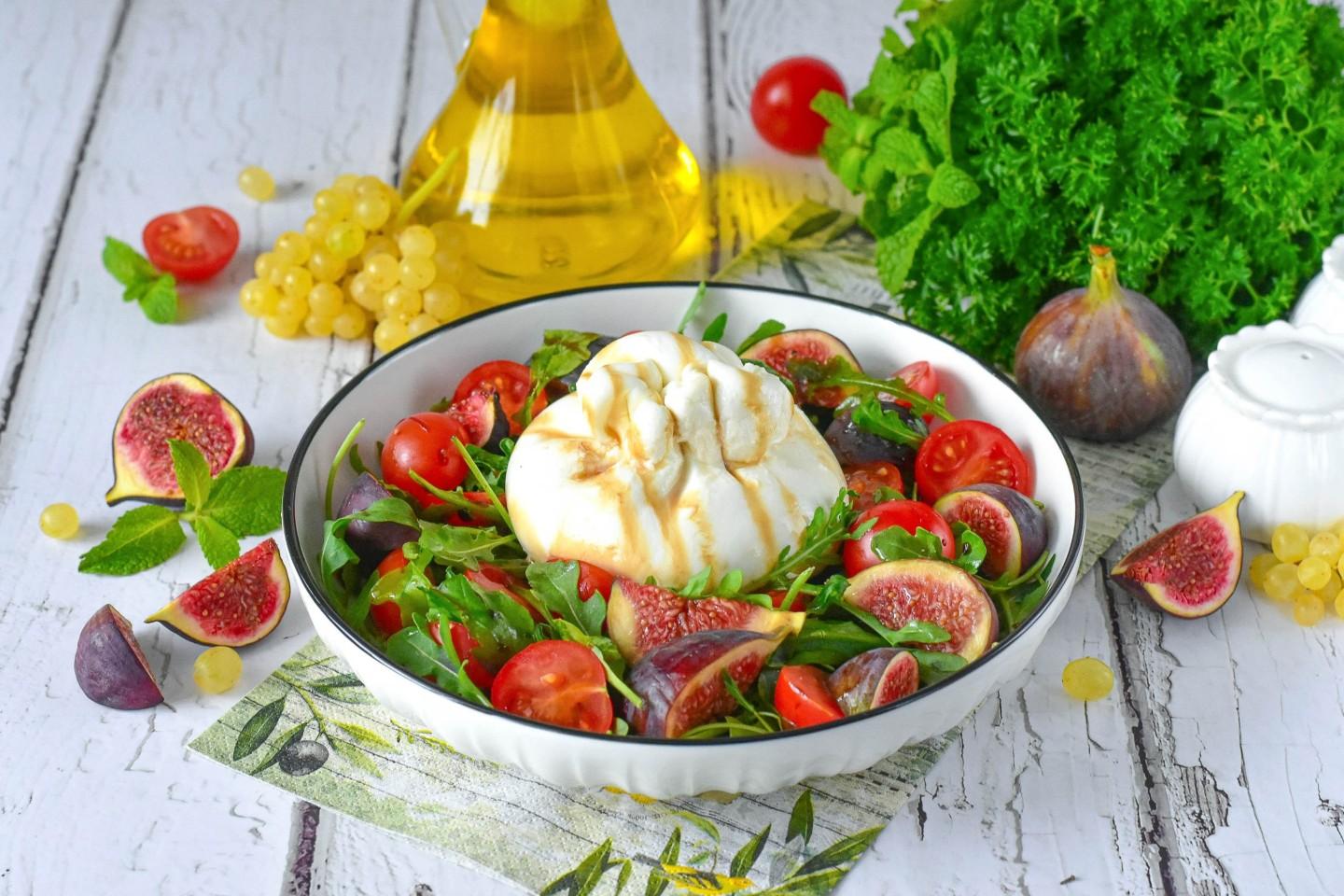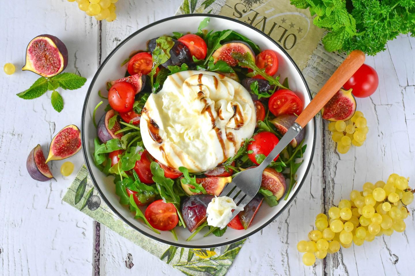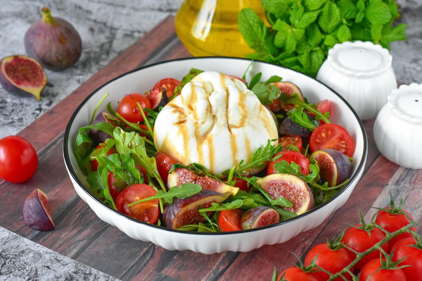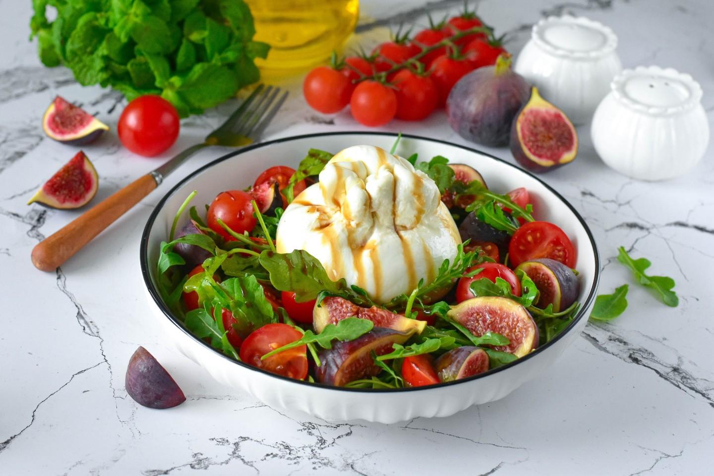 Этот салат с бураттой и помидорами – не просто вкусно, но и полезно! Нежный сыр дает белок и кальций, помидоры черри – ликопин, а руккола и инжир – витамины и клетчатку. Заправка на оливковом масле extra virgin – источник полезных жиров для сердца и красоты кожи.