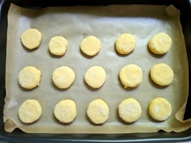 Противень застелите пергаментом. На блюдце насыпьте пару столовых ложек сахара. Возьмите заготовку печенья и опустите ее в песок, слегка приплюснув при этом пальцами. Выложите печенье на противень сахаром вверх. С выбором пергамента поможет статья по ссылке в конце рецепта.