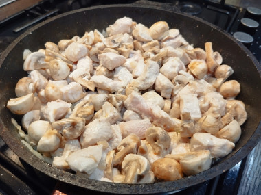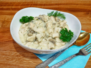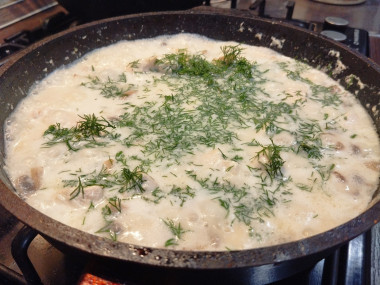 Лук слегка обжарила, добавила кусочки куриного филе. Затем грибы шампиньоны, которые порезала пополам. В конце добавила сметану,разведенную водой и тертый сыр, посыпала измельчённой зеленью укропа.