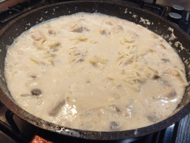 Сметану разведите небольшим количеством кипятка — это нужно, чтобы соус в дальнейшем не свернулся. Вылейте ее в сковороду, перемешайте. Накройте сковороду крышкой, огонь сделайте небольшим. Тушите курицу с грибами около 20 минут. Время зависит от размеров кусков мяса, выбранной сковороды и особенностей работы плиты. Сыр натрите на терке. По прошествии времени всыпьте в сковороду натертый сыр. Перемешайте и подержите блюдо на огне до расплавления сыра.