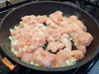 Разогрейте на среднем огне сковороду, влейте на нее растительное масло для жарки. Выложите лук. Обжаривайте его, помешивая, несколько минут, до прозрачности. Затем выложите курицу. Жарьте мясо, помешивая, до изменения цвета. О том, как подобрать идеальную сковороду, а также как правильно выбрать растительное масло, читайте в отдельных статьях, ссылки в конце рецепта.