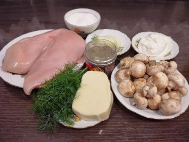 Как сделать курицу с грибами и сыром на сковороде? Подготовьте продукты. У курицы возьмите филе, у меня грудки, но подойдут и бедра. Шампиньоны подойдут как свежие, так и замороженные. Если будете использовать другие грибы, то учитывайте, что они могут иметь другой способ приготовления.