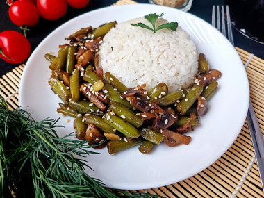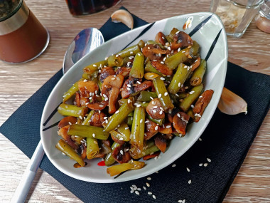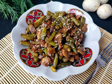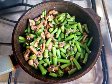 Шампиньоны нарезала толстыми пластинками, обжарила на растительном масле до золотистой корочки. Параллельно в кастрюле отварила стручковую фасоль до готовности. Соединила готовые ингредиенты на сковороде, добавила соевый соус, чеснок (пропущенный через пресс), немного чёрного молотого перца и кунжут. Протушила под крышкой на минимальном огне 3-4 минуты, чтобы вкусы объединились.
