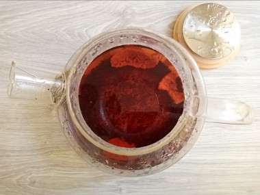 Заварка у меня мелкая, поэтому процеживала чай через ситечко. При заваривании добавила в чайник сухие корочки мандарина.