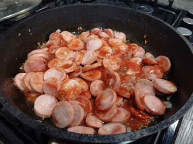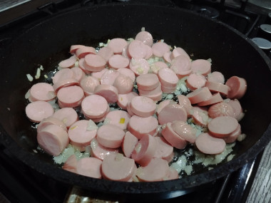 Добавьте сосиски и обжарьте, помешивая, около 5 минут до румяной корочки. При этом следите чтобы лук не подгорел. При необходимости уменьшите огонь.