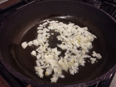 В сковороде на среднем огне разогрейте растительное масло. Выложите лук и обжарьте, помешивая, примерно 1 минуту до прозрачности. Как выбрать сковороду и растительное масло для жарки читайте в статьях на эти темы. Ссылки в конце рецепта.