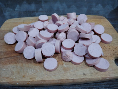 Сосиски очистите от заводской пленки и нарежьте кружочками. Сосиски для блюда можете использовать любые. Но стоит учитывать, что они могут сильно повлиять на итоговый вкус блюда. Например, если возьмете сосиски с ярко выраженным копченым вкусом, то и все блюдо у вас тоже будет с легким вкусом копченостей. Если вам нужен нейтральный вкус, берите обычные сосиски, например молочные или сливочные.
