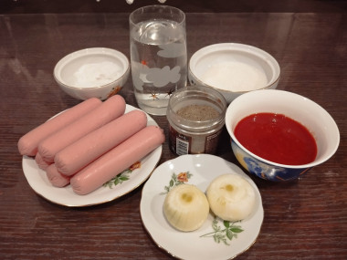 Как сделать Сосиски с томатной пастой на сковороде? Очень просто! Для начала подготовьте необходимые ингредиенты по списку. Сосиски можете заменить сардельками. Помимо указанных специй можете добавить свои по вкусу.