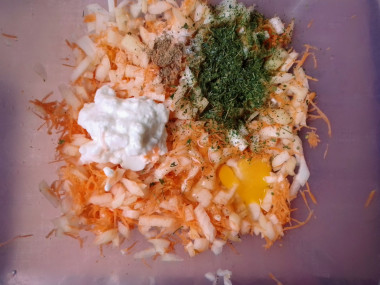 Исходное количество продуктов немного увеличила. Мелко порезала две луковицы, морковь и чеснок измельчила на мелкой тёрке, зелень добавила сушёную, вбила яйцо. Сметану заменила йогуртом. Из специй положила только смесь перцев. Всё хорошо перемешала. Муки добавила 4 столовые ложки. Сново перемешала.