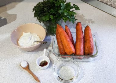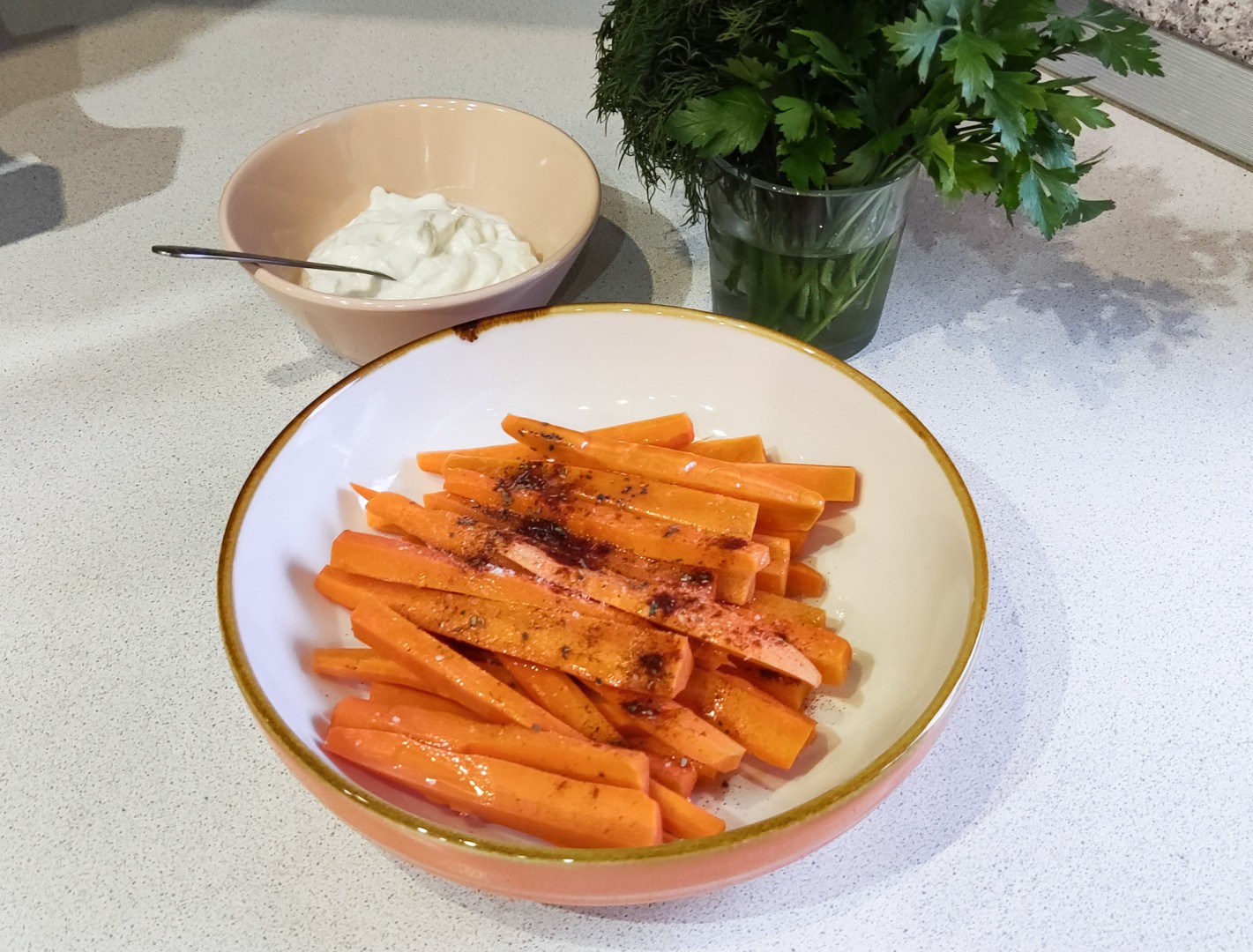 Морковь я запекала на силиконовом коврике примерно 20 минут. Для соуса я взяла греческий йогурт. Помимо зелени добавила соль и перец - люблю более яркие вкусы.