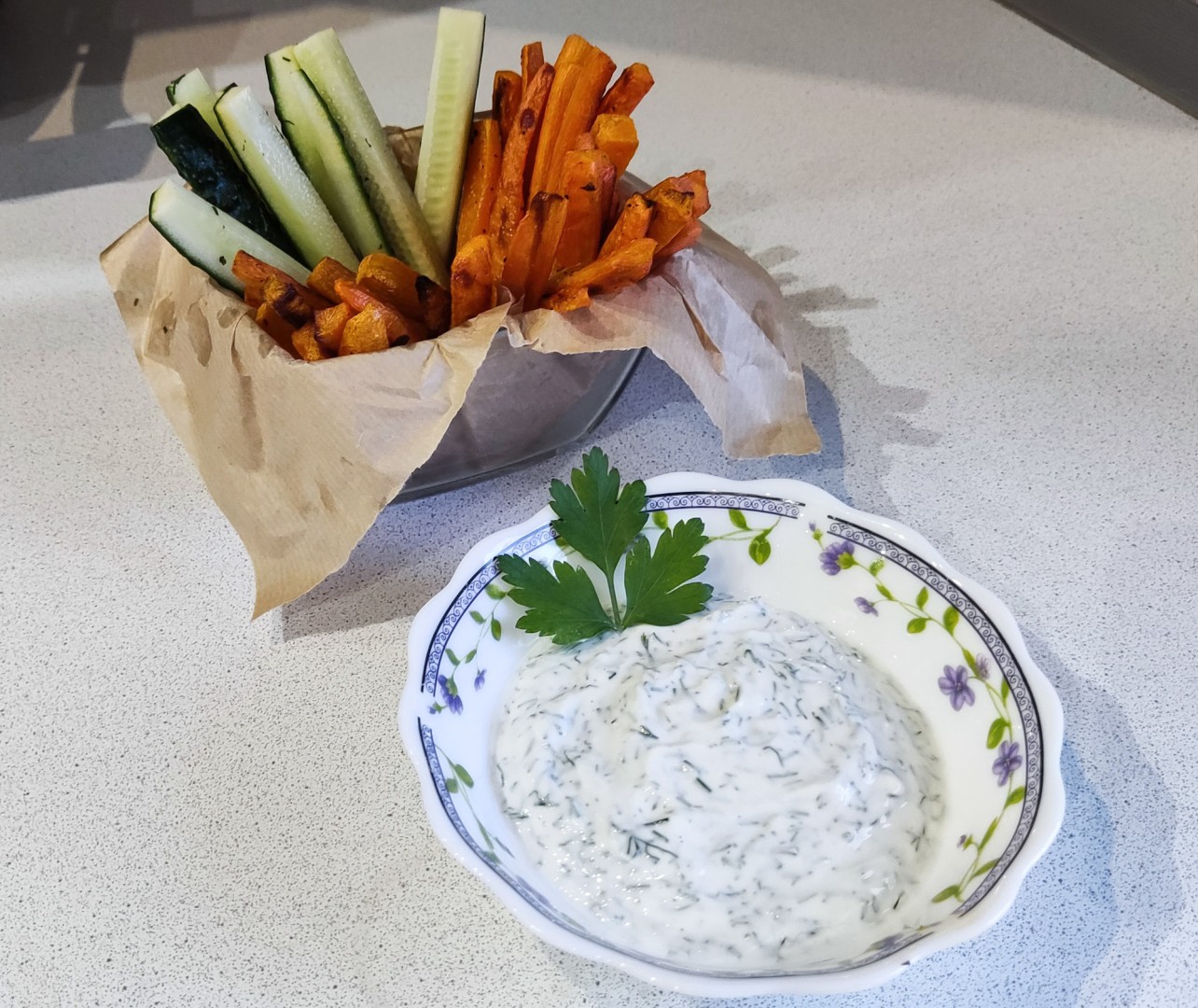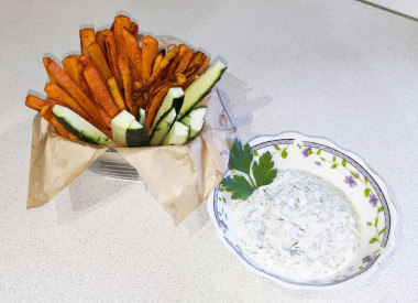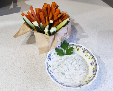 Подала морковные палочки с палочками из огурцов и соусом. Получилось вкусно.