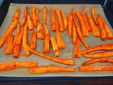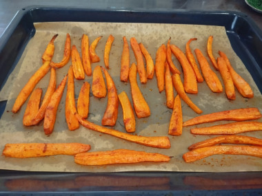 Противень застелите пергаментом и выложите морковные палочки на некотором расстоянии друг от друга. Отправьте противень с морковными палочками в нагретую духовку и запекайте до лёгкого золотистого цвета примерно 15-20 минут. Учтите, что духовки у всех разные и время запекания дано примерно. Узнать об особенностях работы духовок, а также выборе пергамента можно, прочитав отдельные статьи, ссылки в конце рецепта.