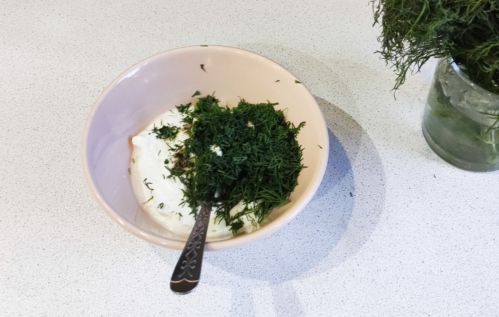 Пока запекаются морковные палочки, приготовьте соус. Для этого просто смешайте натуральный йогурт без добавок и нарезанный мелко укроп. Вместо йогурта вы можете взять нежирную сметану.