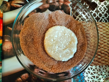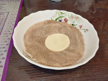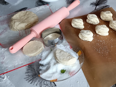 Потом раскатала тесто, вырезала кружочки и обмакнула их в сахаре с обеих сторон, сформировала печенье.