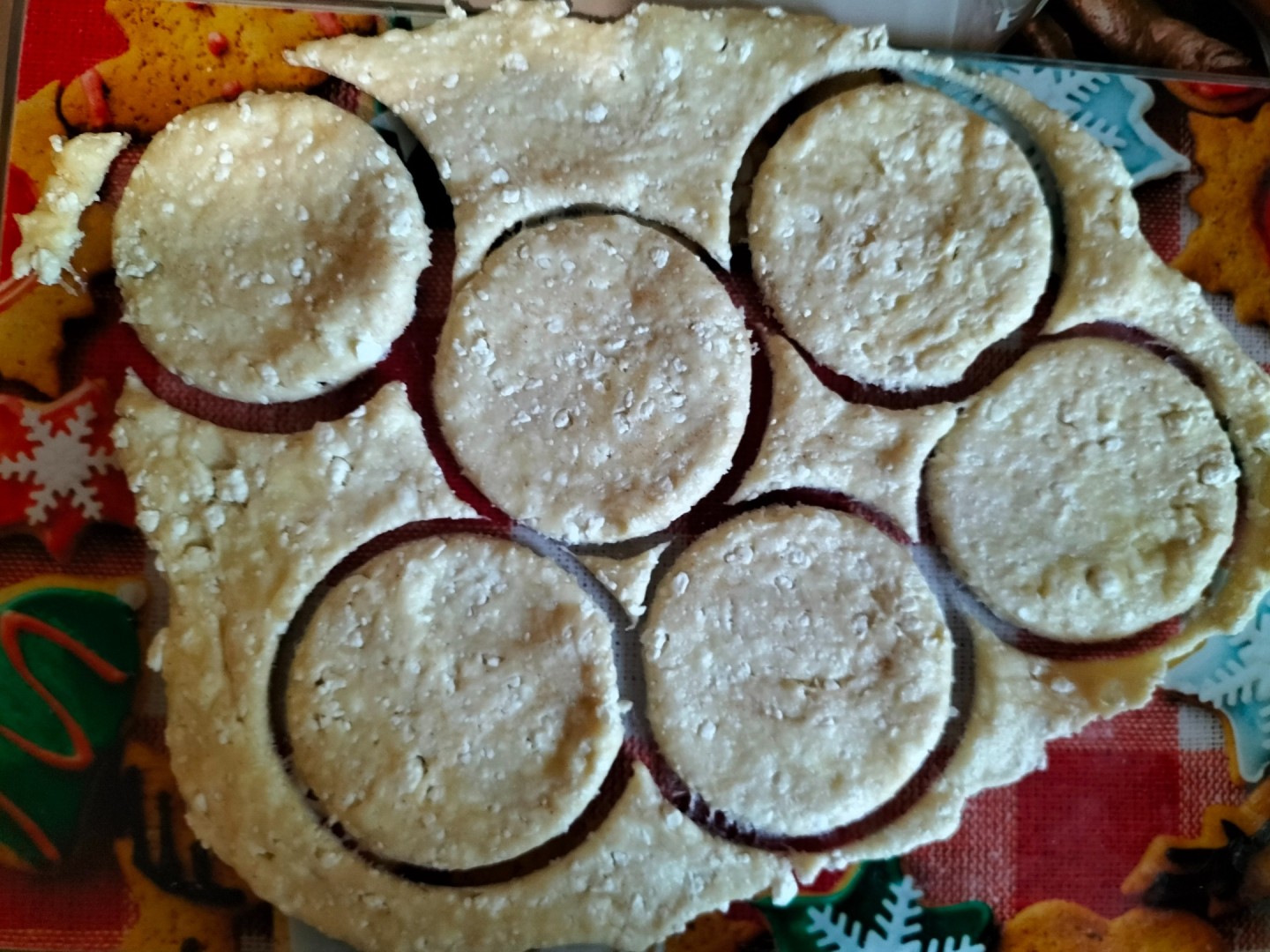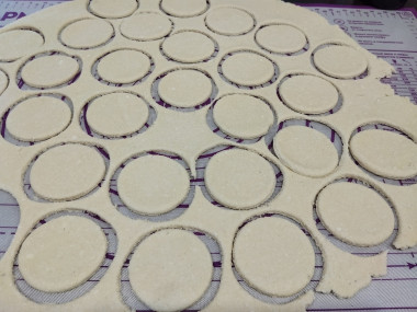 Духовку заранее включите на 190°С. Охлажденное тесто раскатайте на присыпанном мукой столе в пласт толщиной около 5 мм. Стаканом или вырубкой вырежьте из теста кружочки (Ø 8-10 см). Остатки теста между заготовками соберите в шар, раскатайте и снова вырежьте заготовки.