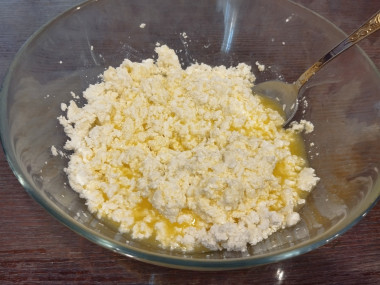 В миске соедините творог, растопленное сливочное масло, ванильный сахар и соду. Все тщательно перемешайте до однородности. Можете взбить массу миксером, но можно просто растереть вилкой.