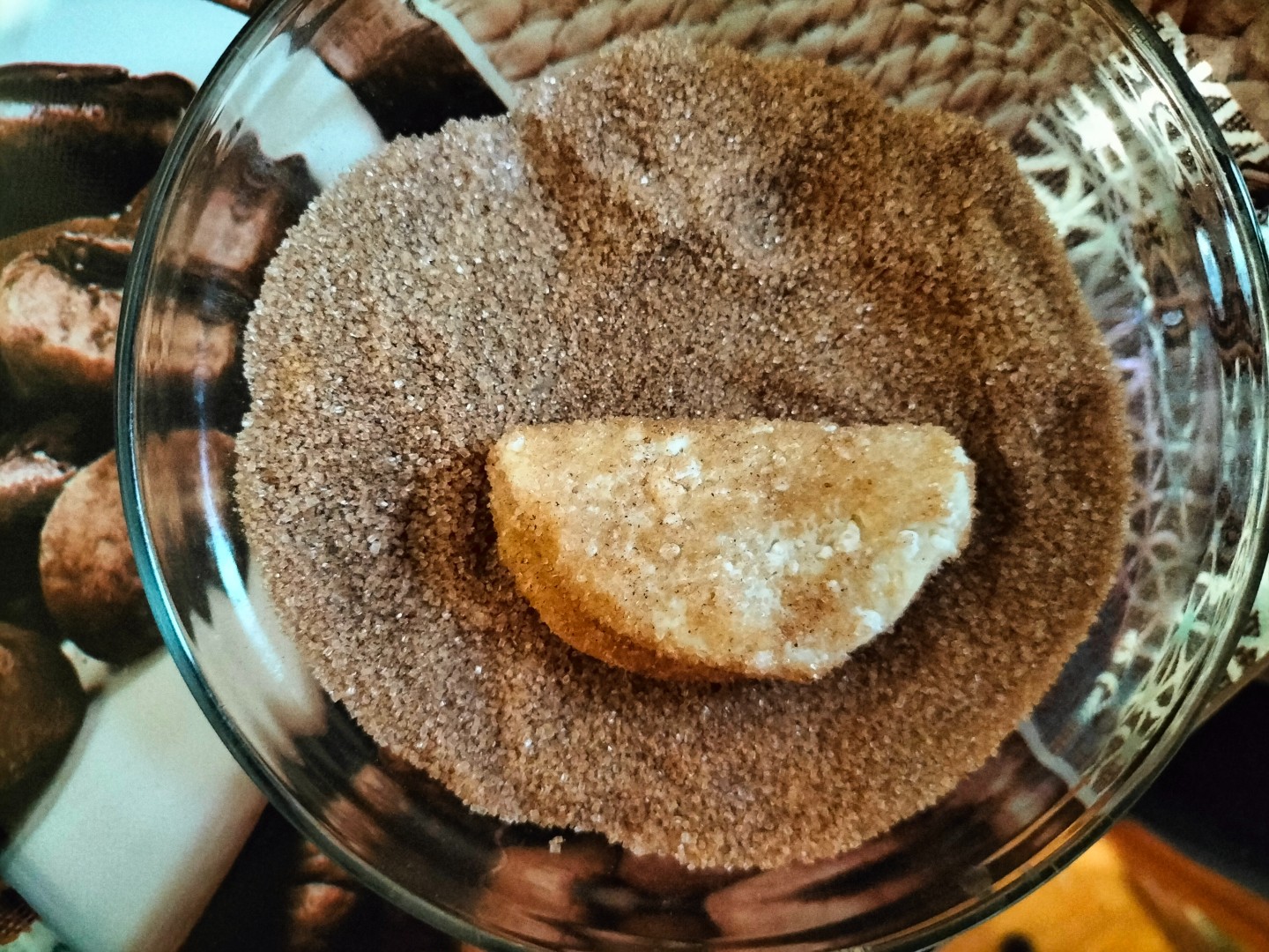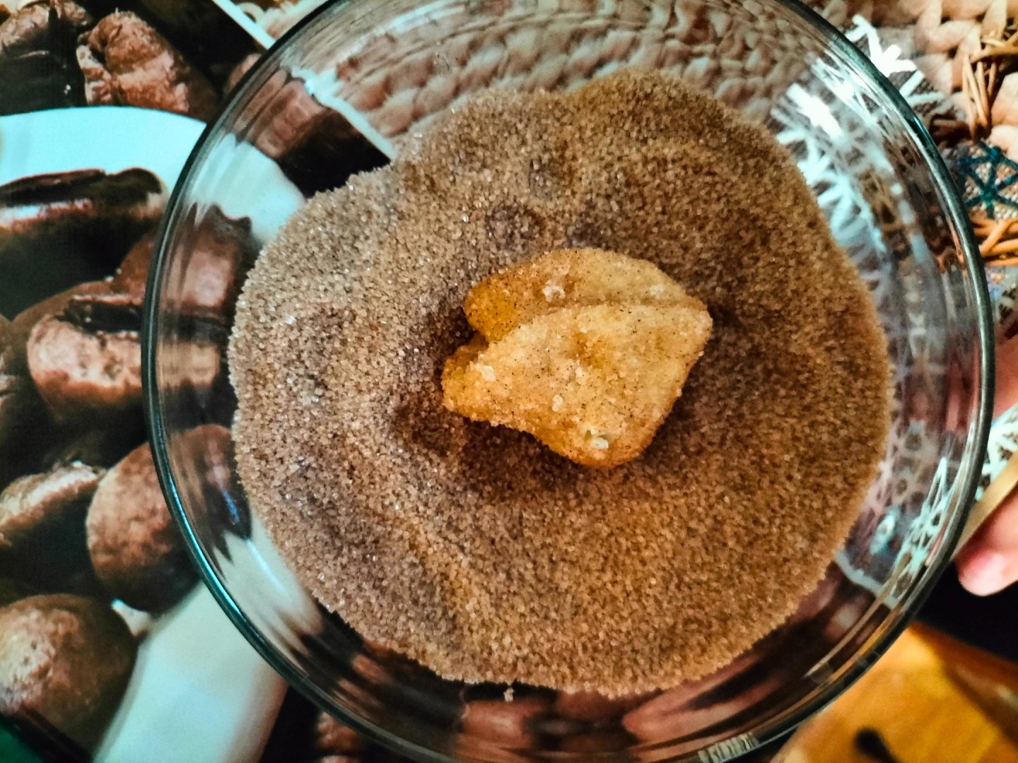 В мисочке смешайте сахар и корицу и отставьте в сторону. Эта смесь не добавляется в тесто, а нужна, чтобы обмакивать в нее заготовки.