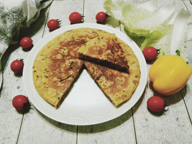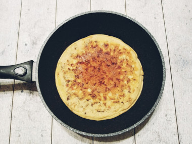 Теперь установите самый минимальный нагрев, который возможен и накройте сковороду крышкой. Не тревожа, выпекайте пирог на плите на сковороде с одной стороны примерно 15-20 минут. Точное время будет зависеть от материала сковороды и особенностей вашей плиты. Ориентируйтесь на вид теста - оно сверху из глянцевого должно стать матовым. Это значит, что пирог можно перевернуть.