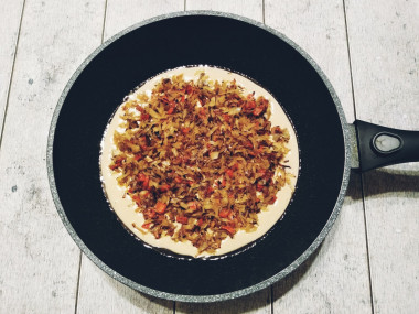 Залейте начинку оставшимся тестом и слегка потрясите сковороду, чтобы тесто равномерно распределилось.