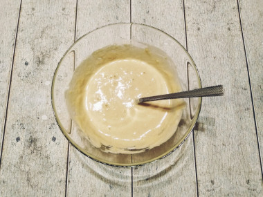 После чего влейте кефир, добавьте сметану и майонез, размешайте их со взбитыми яйцами. Майонез можно сделать самостоятельно. Рецепты домашнего майонеза вы найдёте после последнего шага.