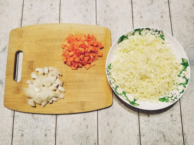 Как испечь заливной пирог с капустой на сковороде на плите? Подготовьте все необходимые продукты. Очистите лук и морковь, сполосните их. Капусту при необходимости очистите от верхних вылях листьев.