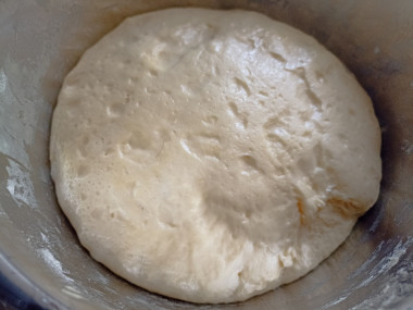 Замесите мягкое тесто, слегка липнущее к рукам. Выложите его в миску, смазанную небольшим количеством растительного масла. Оставьте тесто для подъема в теплом месте на 70-80 минут.