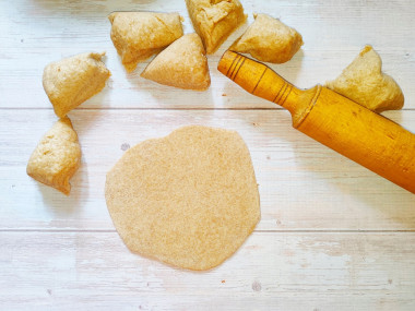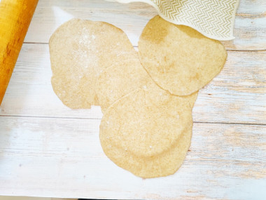 Раскатайте каждую часть в тонкий пласт диаметром 10-15см. При необходимости присыпайте доску мукой, чтобы тесто не прилипало.