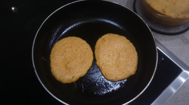 4. Разогрейте сковороду с растительным маслом на среднем огне. Ложкой выложите тесто на сковороду, формируя оладьи. Обжарьте оладьи с обеих сторон до золотистого цвета. Точное время зависит от размера оладьев, выбранной сковороды и особенностей работы вашей плиты. Пожарьте оладьи из всего теста.