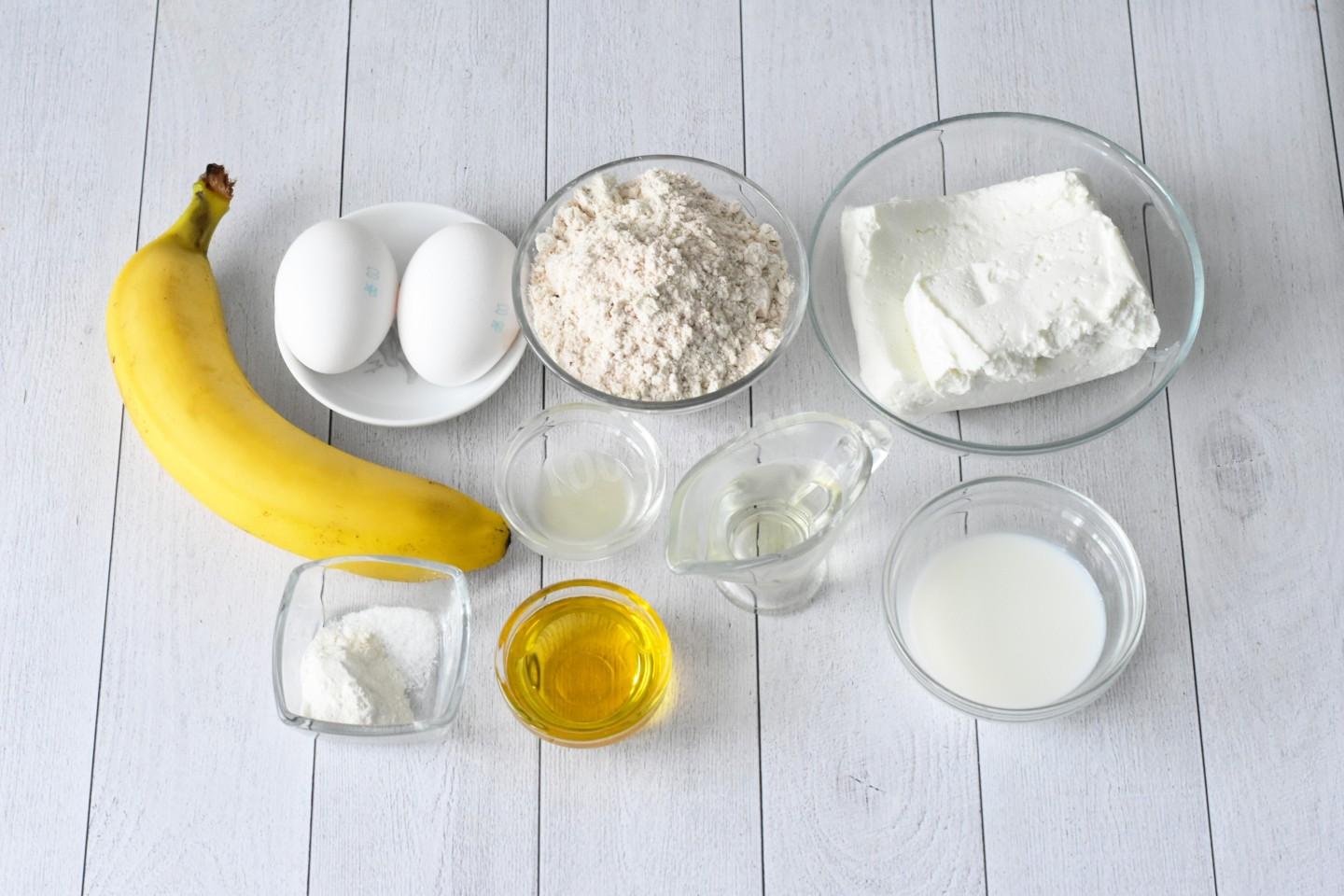 Творог разомните вилкой или при необходимости протрите через сито. В нем не должно остаться комков или твердых крупинок. У меня творог в брикетах. Его можно сразу добавлять в тесто.Добавьте в банановое пюре творог и перемешайте. Подробнее о секретах приготовления выпечки из творога читайте по ссылке ниже.