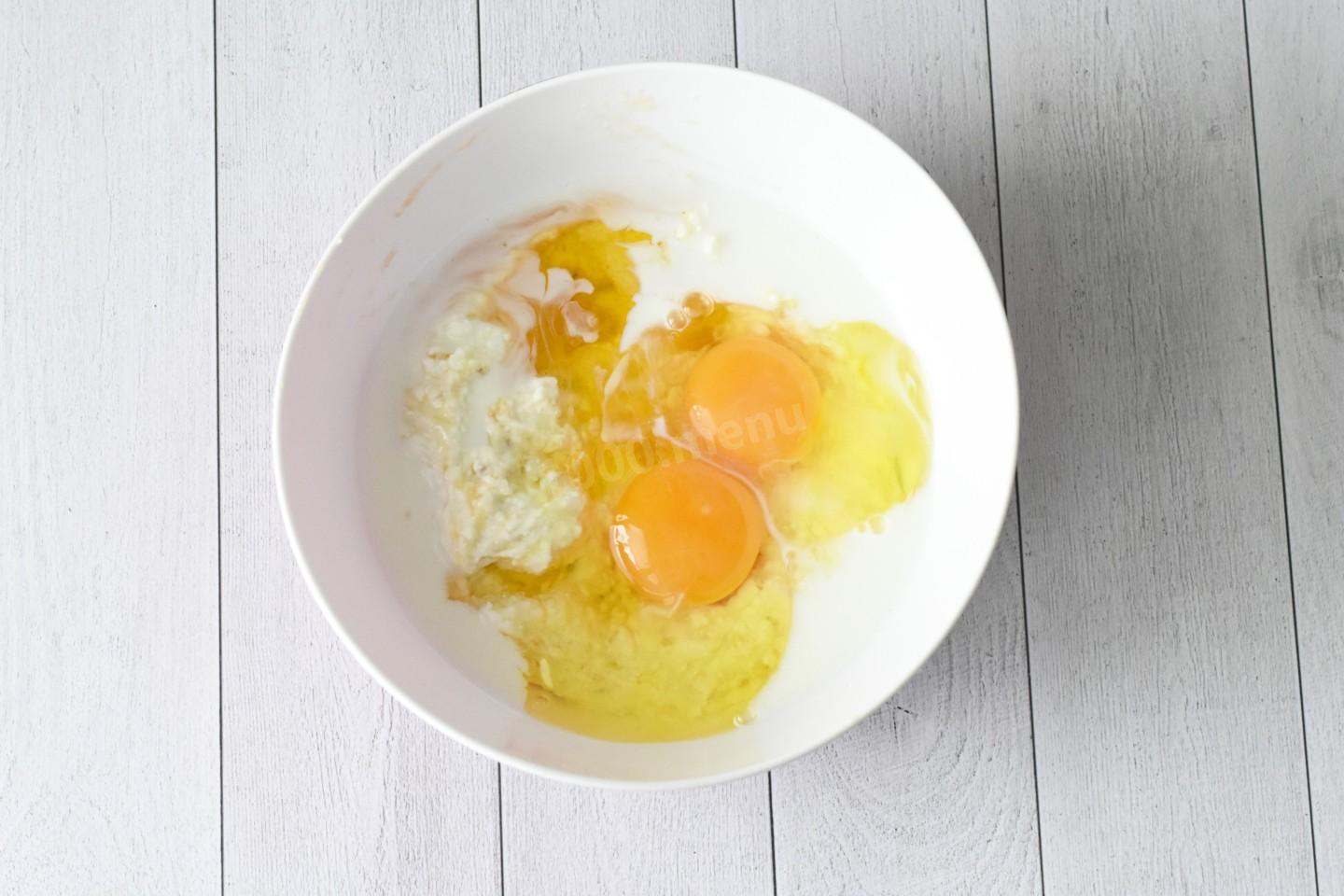 Яйца тщательно вымойте под проточной водой. Добавьте в творожно-банановую массу яйца, молоко и мед. Перемешайте все вилкой или пробейте массу погружным блендером до однородности. Обязательно мойте яйца перед использованием, так как даже на кажущейся чистой скорлупе могут находиться вредные бактерии. Подробнее о выборе яиц и заменах молока читайте в материалах в конце рецепта.