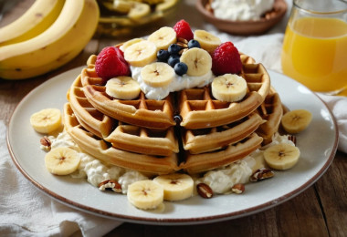 Венские вафли (Wiener Waffeln) отличаются от привычных тонких хрустящих вафель своей толщиной, мягкостью и характерной глубокой решеткой. Они традиционно подаются со сладкими топпингами. Добавление творога и банана — современная домашняя адаптация, которая обогащает классический рецепт и делает его более питательным.