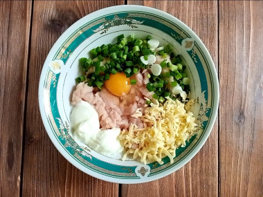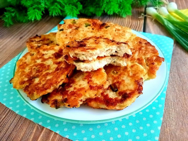 При разделки курицы все не могла решить что сделать с грудкой. Поискала на сайте рецепты и нашла подходящий. Оказалось, что оладьи из куриной грудки рубленые готовятся очень быстро. По крайней мере "тесто" замесить проще простого. Кефир я заменила домашним густым йогуртом, а репчатый лук зеленым. После замеса "тесто" получилось густым, поэтому муку не стала добавлять.
