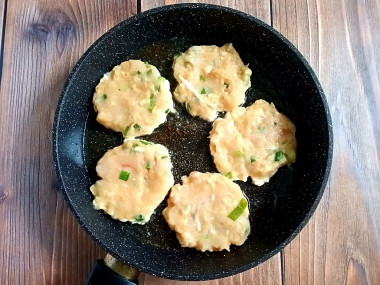 Для жарки берите удобную широкую сковороду. Разогрейте её до горячего состояния и налейте немного растительного масла. Ложкой выкладывайте немного куриного теста и обжаривайте его на небольшом огне по 3-4 минуты. Как выбрать сковороду и масло для жарки читайте в отдельных статьях в конце рецепта.