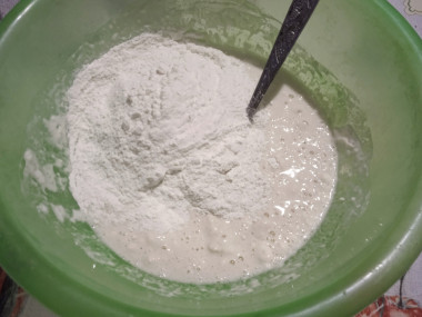 Всыпаем просеянную пшеничную муку. Просеивать муку обязательно и делать это лучше несколько раз, чтобы хорошо насытить кислородом. Муку добавляем частями, каждый раз промешивая массу.