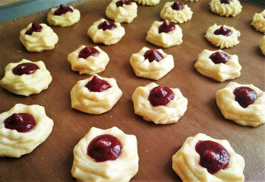 Противень для выпечки застелите пергаментом и выдавите по всей поверхности печеньки. В центре сделайте небольшие углубления.