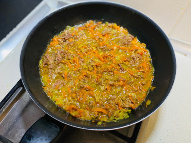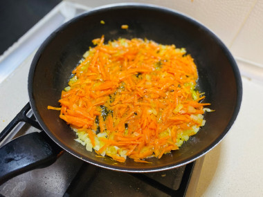 Морковь натрите на крупной терке и добавьте в сковороду к обжаренному луку. Жарьте овощи на среднем огне в течение около 6-7 минут, перемешивая. Если хотите, чтобы морковь была более выражена в блюде, порежьте ее средней соломкой и увеличьте время обжаривания на 1-2 минуты.