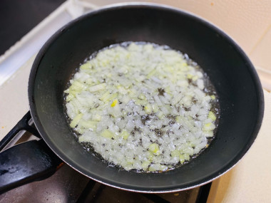 В сковороду налейте растительное масло и разогрейте на среднем огне. Репчатый лук порежьте полукольцами и положите в сковороду. Обжаривайте в течение примерно 4-5 минут, перемешивая. О том, как подобрать идеальную сковороду, а также как правильно выбрать растительное масло, читайте в отдельных статьях, ссылки в конце рецепта.