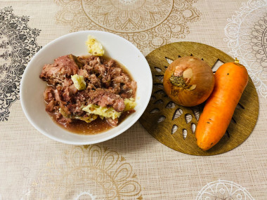 Это простое блюдо приготовит даже студент. Берете банку тушенки, луковицу и морковку.