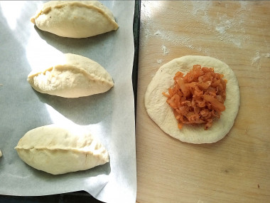 Каждый шарик раскатайте на присыпанной мукой поверхности в круглую лепешку диаметром 10-12 см. В центр выложите по 1-2 ст. л. начинки. Защипайте края, придавая пирожку овальную или треугольную форму. Заготовки выложите на застеленный пергаментом противень
