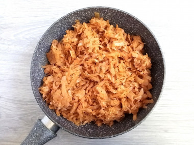 Обычно капустную начинку делаю из капусты, моркови и лука. В этот раз сделала по этому рецепту: потушила капусту с томатной пастой. Получилось очень вкусно! Начинку тушила в мультиварке, т. к. не было возможности воспользоваться плитой. Нарезала капусту соломкой по привычке.