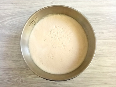 В 100 мл теплой воды (37-40℃) растворите сахар, соль и сухие дрожжи. Влейте растительное масло и перемешайте.