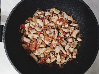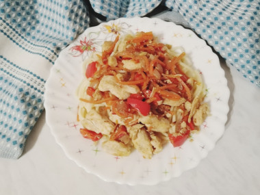 Корейская морковь и сладкий перец - те главные герои, которые придают курице необыкновенные нотки пикантного вкуса.