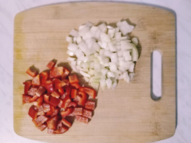 Как сделать курицу с морковью по-корейски и болгарским перцем на сковороде? Подготовьте все необходимые ингредиенты для приготовления. Болгарский перец вымойте и обсушите. Репчатый лук, чеснок и болгарский перец почистите, филе грудки сполосните и обсушите. Вместо курицы можно взять филе индейки.