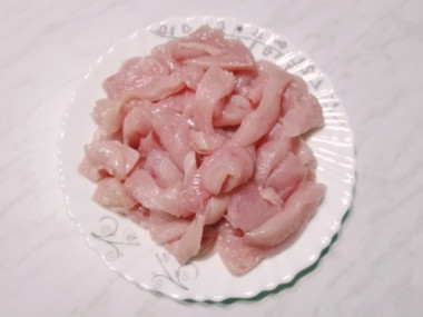 Филе грудки порежьте соломкой. В сковороду налейте растительное масло и разогрейте на сильном огне. О том, как подобрать идеальную сковороду, а также как правильно выбрать растительное масло, читайте в отдельных статьях, ссылки в конце рецепта.