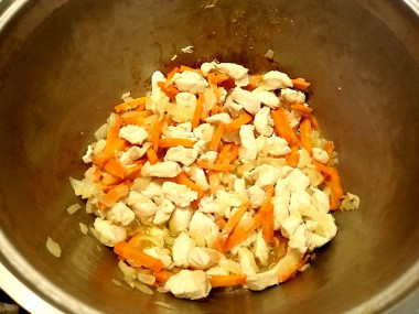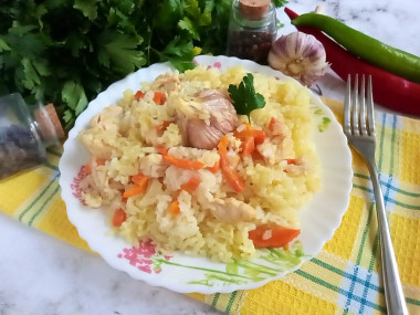 Зирвак я делала из куриных грудок, нарезала их тонкими кусочками, чтобы лучше пропитались овощными соками. Лук нарезала кубиками, а морковь крупными брусочками, чтобы не развалились во время варки. После интенсивной обжарки потушила зирвак минут 20 на небольшом огне. После этого засыпала рис (специальный для узбекского плова) и залила водой. Головку чеснока тоже всегда втыкаю в середину, чтобы плов приобрел аппетитный аромат. Из специй взяла приправу для курицы. Хорошо бы добавить зиру, но мои дети ее не любят.