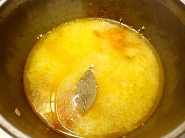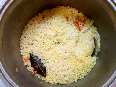 Заливаем холодной водой, чтобы рис покрылся на 1-1,5 см. Солим и кладем лаврушку. Не перемешиваем!