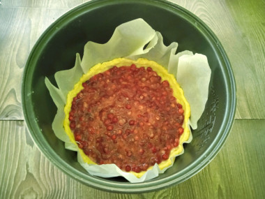 В чашу мультиварки выложить песочное тесто, сформировать высокие бортики. При выпечки крем поднимается, поэтому при формировании бортиков подъем необходимо учитывать. выложить ягоды и яблоки.